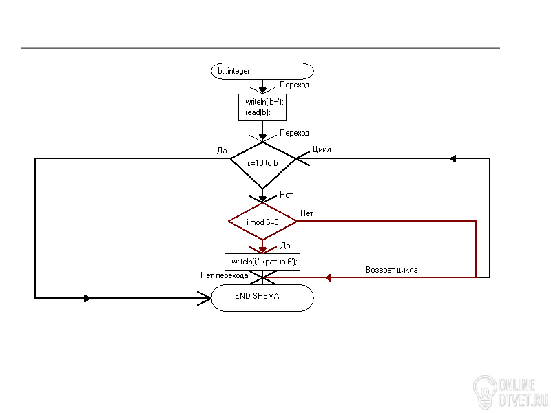 Напишите блок-схему, выводящую на экран все двузначные числа кратные 6 из отрезка [10, В]. В задается с клавиатуры.