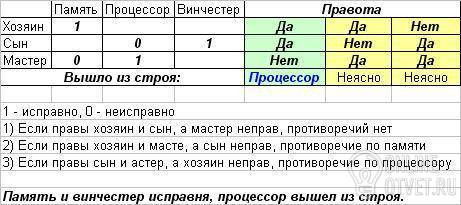 Когда сломался компьютер, его хозяин сказал «Память не могла выйти из строя». Его сын предположил, что сгорел процессор, а винчестер исправен. Пришедший специалист по обслуживанию сказал, что, скорее всего, с процессором все в порядке, а память неисправна. В результате оказалось, что двое из них сказали все верно, а третий – все неверно. Что же сломалось? P.S. формализуйте задачу и либо с помощью сокращения либо с таблицами истинности.