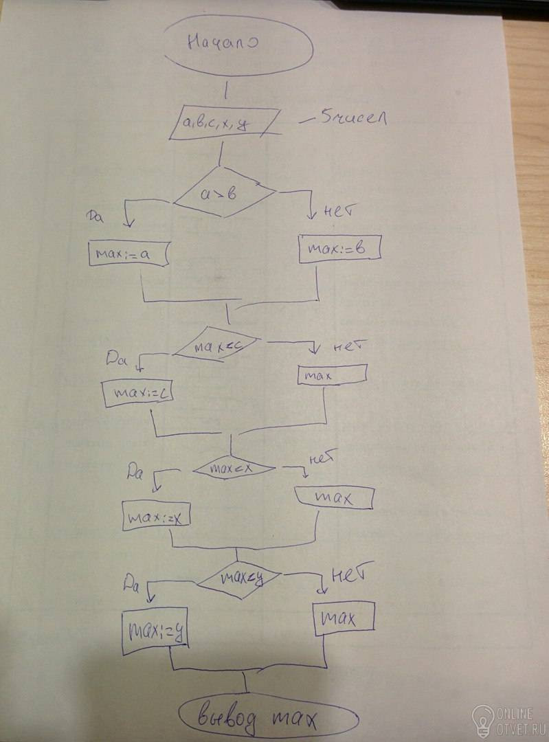 Ввести пять чисел и найти наибольшее из них.4 15 9 56 4 ... 1.составьте блок -схему алгоритма