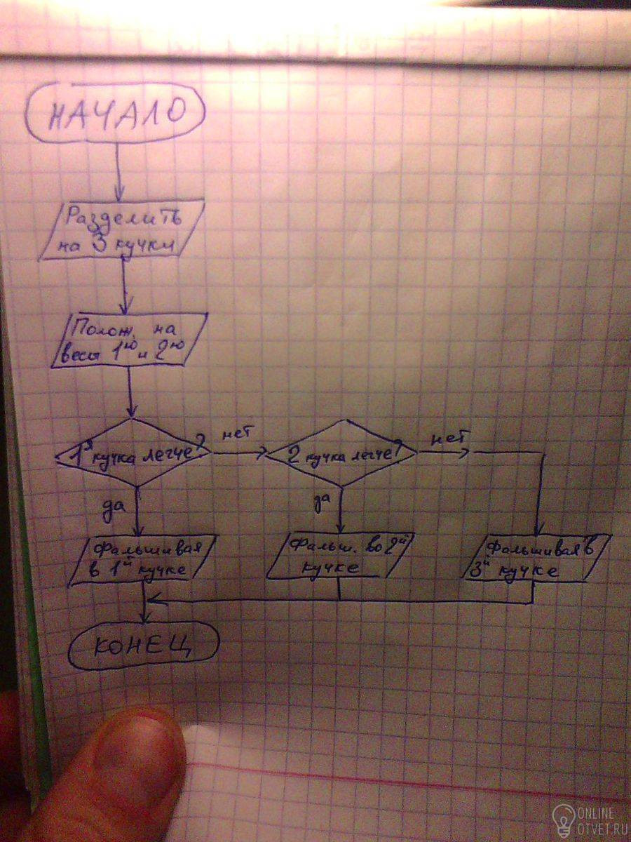 3)Положить 3 кучу на весы ,если одна из куч легче остальных значит фальшивая монета в ней