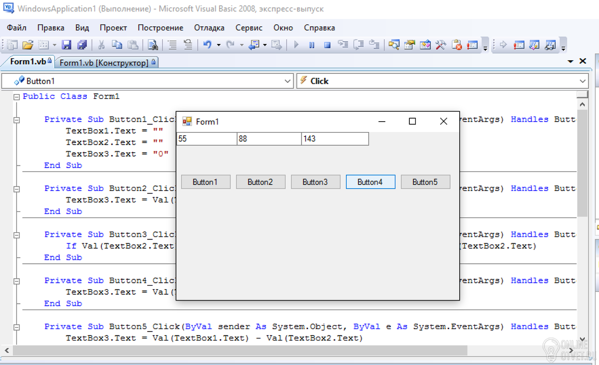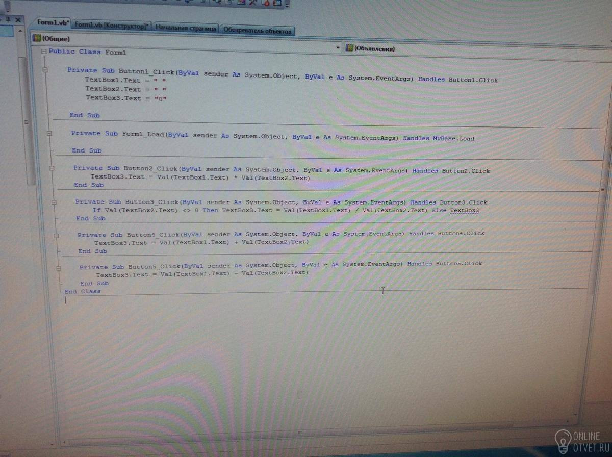 Под рукой был только VisualStudio 2008 Express Edition. Из кода видно, что вы используете Visual Basic. Создал в конструкторе форму, расположил на форме 3 textbox и 5 button. Заполнил процедуры - обработчики события click для каждой кнопки как в вашем коде. Запустил и все работает. Код почти не отличается от вашего.