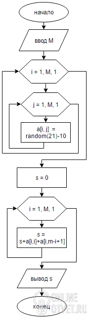 Блок-схема - в прилагаемом файле (в схеме средний элемент матрицы при нечетном M будет учитываться дважды).