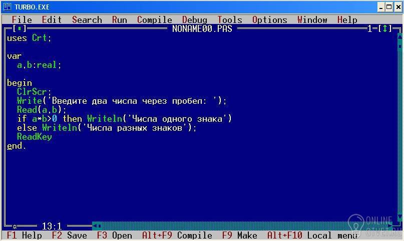 Составить программу Turbo Pascal 7.01 : заданы числа a и b. Определить, эти числа одного или разных знаков