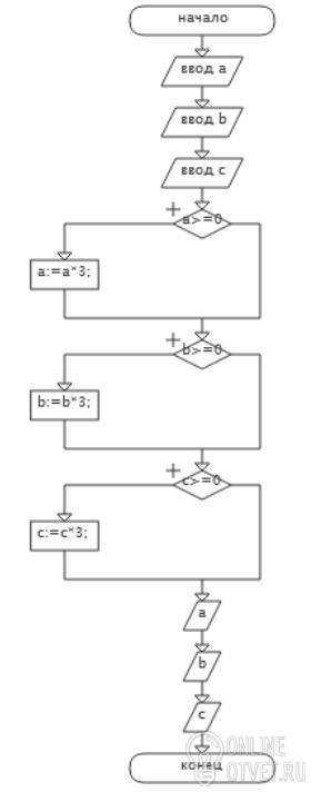 Помогите умняшки! Даны три числа. все неотрицательные числа увеличить в 3 раза. Составить алгоритм с помощью блок схемы.