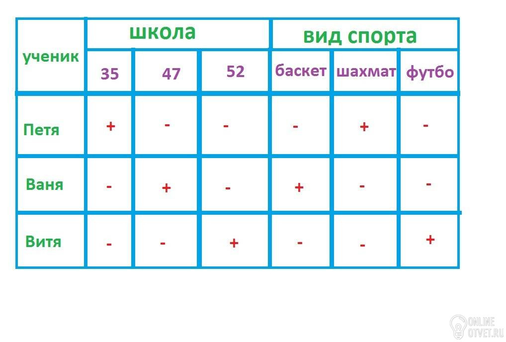 Три друга Петя, Ваня и Витя Учатся в разных школах: 35, 47 и 52. Все друзья занимаются в разных спортивных секциях: баскетбол, шахматы и футбол.