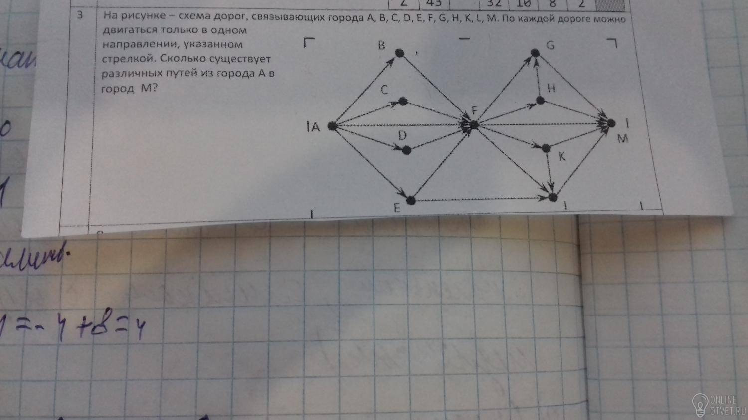 Из Ж есть путь только в И, поэтому кол-во маршрутов из Ж в М также равно 2. Следовательно, количество маршрутов из З в М равно 4, так как из З можно попасть в Ж (2 маршрута) или в И (2 маршрута): 2+2=4. Аналогично из Е: количество маршрутов равно также 4.