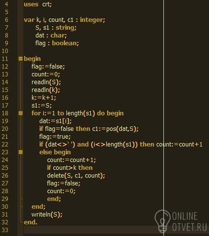 В заданной произвольной строке S удалить слово, если количество букв в нём превышает заданную величину K (K вводится с клавиатуры).