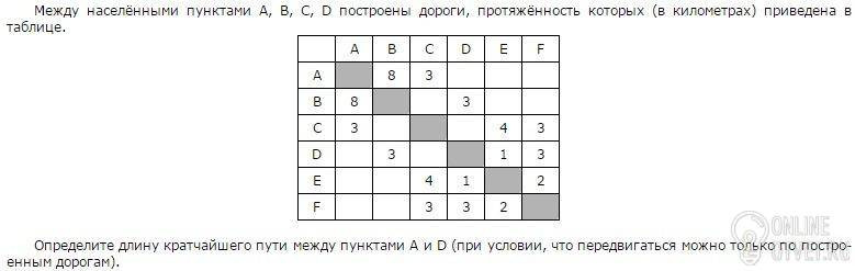 Из А идём в С (длина дороги 3), потом из С в F (длина дороги 3), а потом из F в D (длина дороги 3). 3+3+3=9