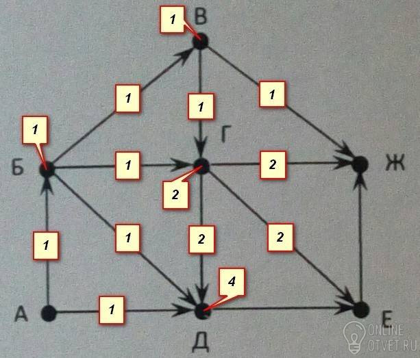 4. Из точки Г выходят три стрелки - пишем на каждой из них число 2, указанное у Г. В точке Д сошлись три стрелки и все имеют написанные на них числа. Это позволяет записать возле Д сумму чисел со стрелок 1+1+2=4.