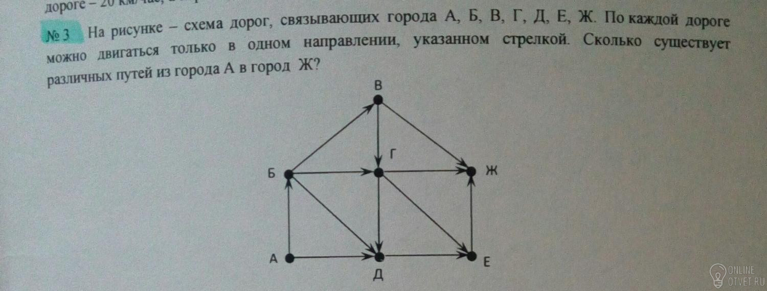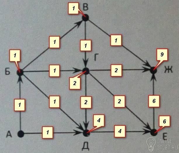 5. Из точки Д в Е ведет одна стрелка - переносим на нее число 4. В точку Е пришли стрелки с числами 4 и 2, записываем возле нее 2+4=6 и переносим это число 6 на стрелку, ведущею из Е в Ж. Теперь все стрелки, ведущие в Ж имеют числа, находим сумму этих чисел: 1+2+6=9. Это и есть ответ.