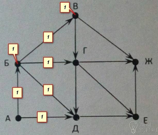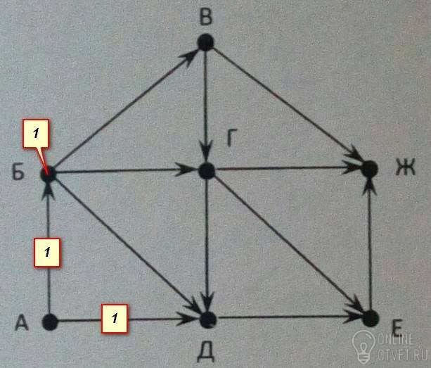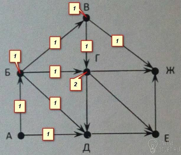 3. Из точки В выходят две стрелки, ведущие в Г и Ж. Пишем на них число 1, взятое с точки В. В точку Г приходят две стрелки и на них уже надписано количество путей. Записываем у точки Г сумму чисел со стелок, ведущих в Г: 1+1=2.