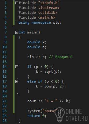 Напишите алгоритм. Задается Р. Рассчитать и вывести К. К= √Р, Р^2, Р>0, P<0 ( это все система)