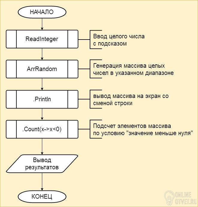 Написать программу в паскале: подсчитать количество элементов массива целых чисел,меньших 0. и блок схему, срочно пожалуйста