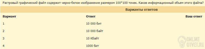 Объем изображения = 100*100*1 бит = 10 000 бит