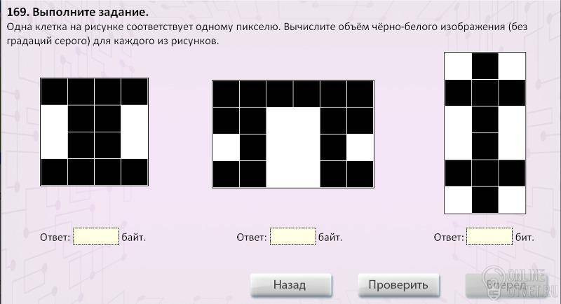 Итого: 1) 4 * 4 / 8 = 2 байта; 2) 4 * 6 / 8 = 3 байта; 3) 6 * 3 = 18 битов.