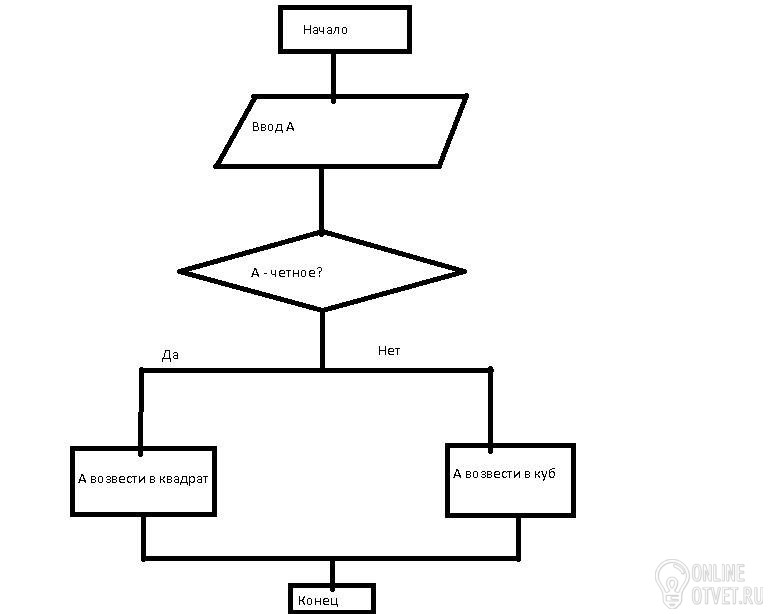 Дано числа А ,если А четное то возвести в квадрат ,если А не четное то в куб ,Начертите блок - схемой
