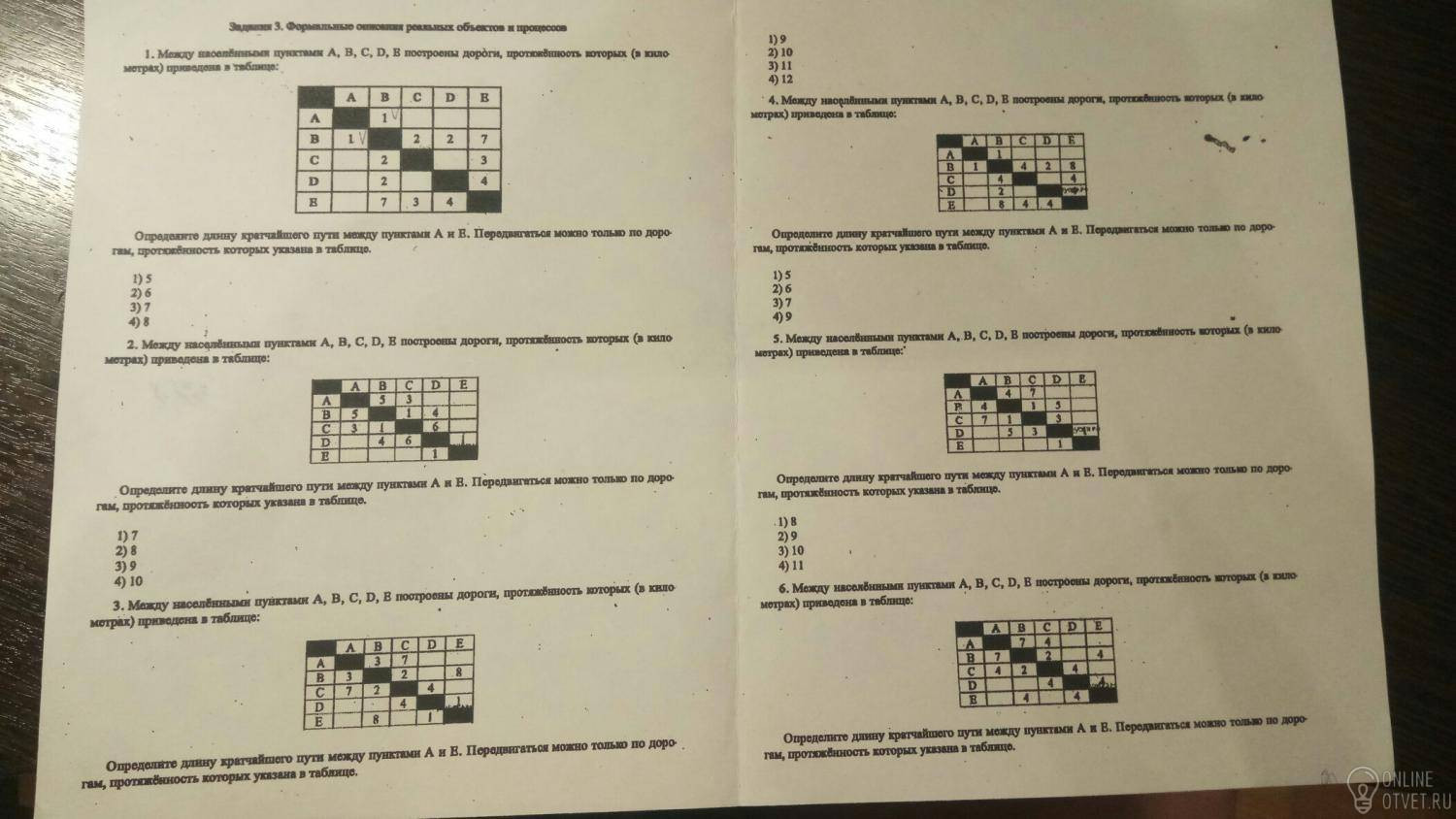 Там есть разделяющая диагональ (Диагональ из чёрных прямоугольников), одну половину можно убрать, либо ту которая находится снизу диагонали, либо ту которая находится сверху диагонали. Я всегда убираю верхнюю часть. А теперь просто ищем путь от А до Е. Смотрим короткие пути от буквы А: есть единственный путь до буквы В, он равен 1 (это не точно, так как изображение плохого качества), потом смотрим пути от буквы В, (даю совет не всегда надо идти от буквы по самому короткому пути, то есть например от буквы В до буквы С расстояние равно 2, от С до Е расстояние равно 4, в сумме получается 6, но может быть от В до D расстояние равно 3, от D до Е расстояние равно 2, в сумме получается 5, то есть меньше, так что надо смотреть на последующие числа) их три, до С = 2, до D = 2, до Е = 7 (не точно, изображение плохого качества), есть два коротких пути с одинаковыми значениями так что смотрим на какие пути они выведут нас, от С до Е путь равен 3, а от D до Е путь равен 4, следовательно короче от С до Е, а теперь слаживаем все пути, в начале мы пошли от А до В (1), потом от В до С (1+2) от С до Е (1+2+3), в итоге получился путь А->В->С->Е, равный 6, следовательно минимально количество путей равно 6, ответ 2) (Вроде бы, не видно).