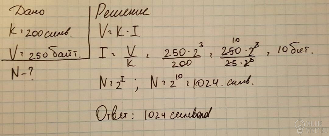 Сообщение содержит 200 символов .Сколько символов в алфавите ,если все сообщение содержит 250 байтов информации