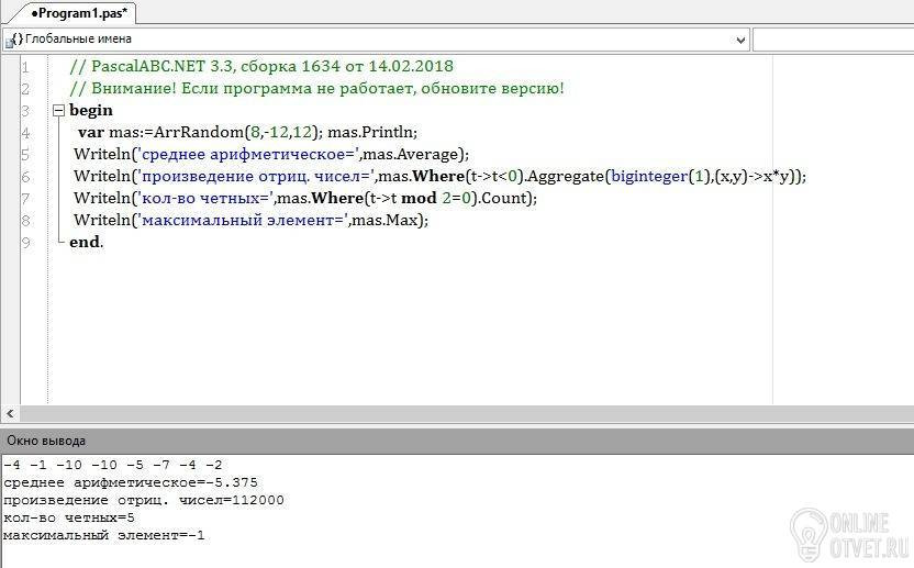 var mas:=ArrRandom(8,-12,12); mas.Println;