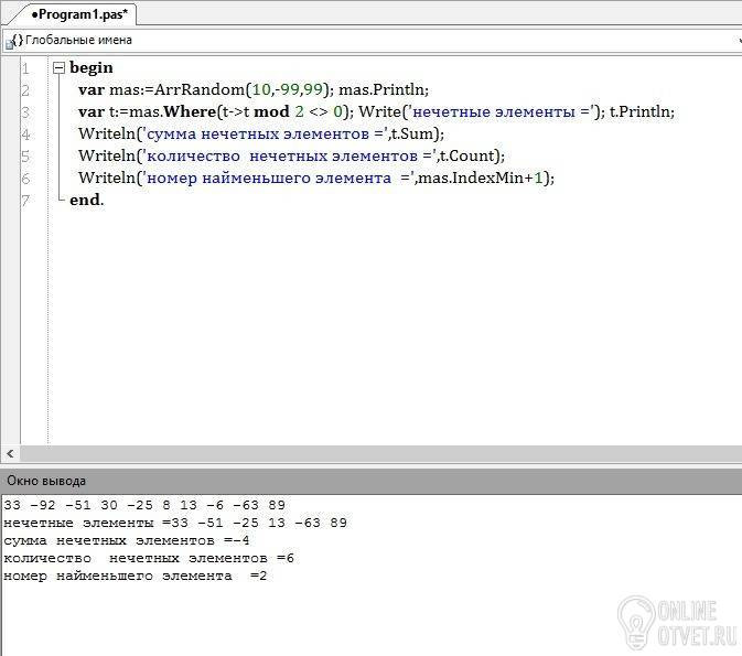 var t:=mas.Where(t->t mod 2 0); Write('нечетные элементы ='); t.Println;