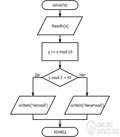 нужна блок-схема для задачи Дано натуральное число. Верно ли, что оно заканчивается: - нечетной цифрой; - четной цифрой (составные условия не использовать)