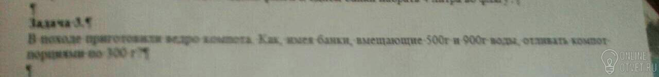 Либо заполнить обе банки на половину(250 и 450 г) и далее из банки 500 г перелить 250 г и получится 700г,далее перелить в банку 500г 500 г и в банке 900г останется 200г,в банку 500г залить 2/10 и перелить в банку 900г,получится 300г.