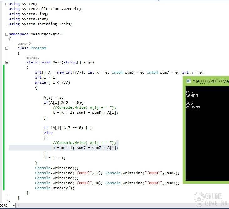 Даны натуральные числа А1, А2, ...... Признак конца последовательности 777. Найти количество и сумму тех членов последовательности, которые делятся на 5 и не делятся на 7. Цикл с пред условием на языке c#