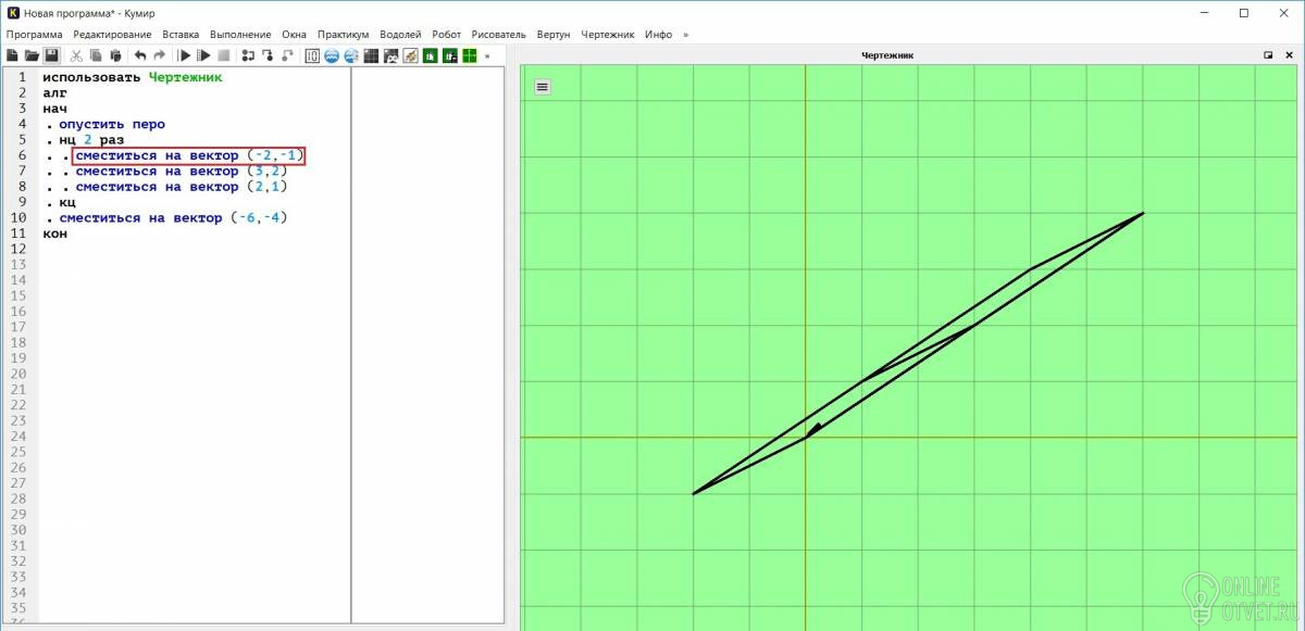 Исполнитель Чертёжник перемещается на координатной плоскости, оставляя след в виде линии. Чертёжник может выполнять команду Сместиться на (a, b) (где a, b — целые числа), перемещающую Чертёжника из точки с координатами (x, у) в точку с координатами (x + а, у + b). Если числа a, b положительные, значение соответствующей координаты увеличивается; если отрицательные, уменьшается. Например, если Чертёжник находится в точке с координатами (4, 2), то команда Сместиться на (2, −3) переместит Чертёжника в точку (6, −1). Запись Повтори k раз Команда1 Команда2 КомандаЗ Конец означает, что последовательность команд Команда1 Команда2 КомандаЗ повторится k раз. Чертёжнику был дан для исполнения следующий алгоритм: Повтори 2 раз Команда1 Сместиться на (3, 2) Сместиться на (2, 1) Конец Сместиться на (−6, −4) После выполнения этого алгоритма Чертёжник вернулся в исходную точку. Какую команду надо поставить вместо команды Команда1? 1) Сместиться на (−2, −1) 2) Сместиться на (1, 1) 3) Сместиться на (−4, −2) 4) Сместиться на (2, 1)