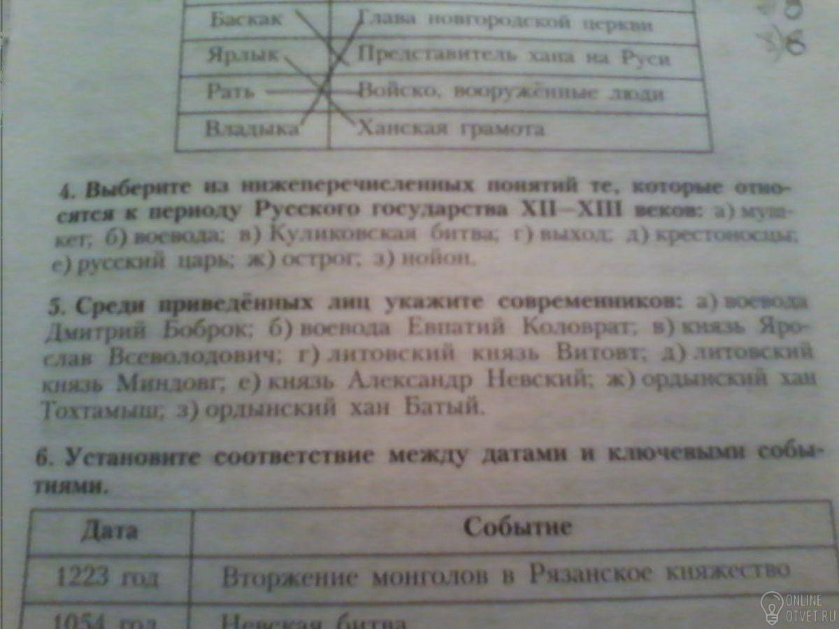 5. Современники - это люди, жившие в одно время. В данном случае современниками являются по отношению друг к другу во-первых: б) Коловрат(начало 13 века), в) Ярослав Всеволодович(нач.13 века), д) Миндовг(нач.13 века), е) А.Невский(нач.13 века) и з) Батый(нач.13 века).