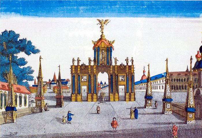 Ворота была сделаны по типу древнеримской триумфальной арки, жители столицы их очень полюбили, поэтому и назвали Красными, от слова «красивые». Изначально постройка заканчивалась грациозным шатром, на котором красовалась фигура трубящей Славы с пальмовой ветвью. Над проходом поместили портрет Елизаветы, который со временем украсили медальоном с гербом и вензелями. По бокам, над дополнительными проходами, располагаются рельефы в честь опять-таки императрицы, а над ними еще и статуи как символы Бдительности, Милости, Постоянства, Верности, Торговли, Экономии, Изобилии и Мужества. На ворота было нанесено около 50 различных изображений. Когда в 1928 г. Площадь реконструировали, то и это великое сооружение безжалостно разобрали, сейчас здесь стоит обычный серый павильон метро, ассоциирующийся совсем с другим временем.Про Петровскую эпоху теперь перестали говорить, когда архитекторы окончательно достроили Петербург, который стал столицей. Двигаясь к завершению 18 в., опять все строительство вернулось в Москву. Активно начали возводить светские дома и дворцы, церкви, учебные и медицинские учреждения. Лучшими архитекторами времен Екатерина II и Павла I стали Казаков и Баженов.