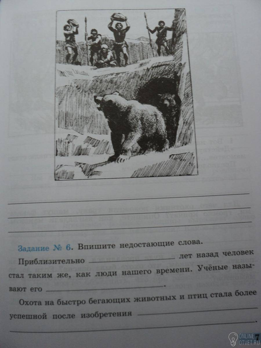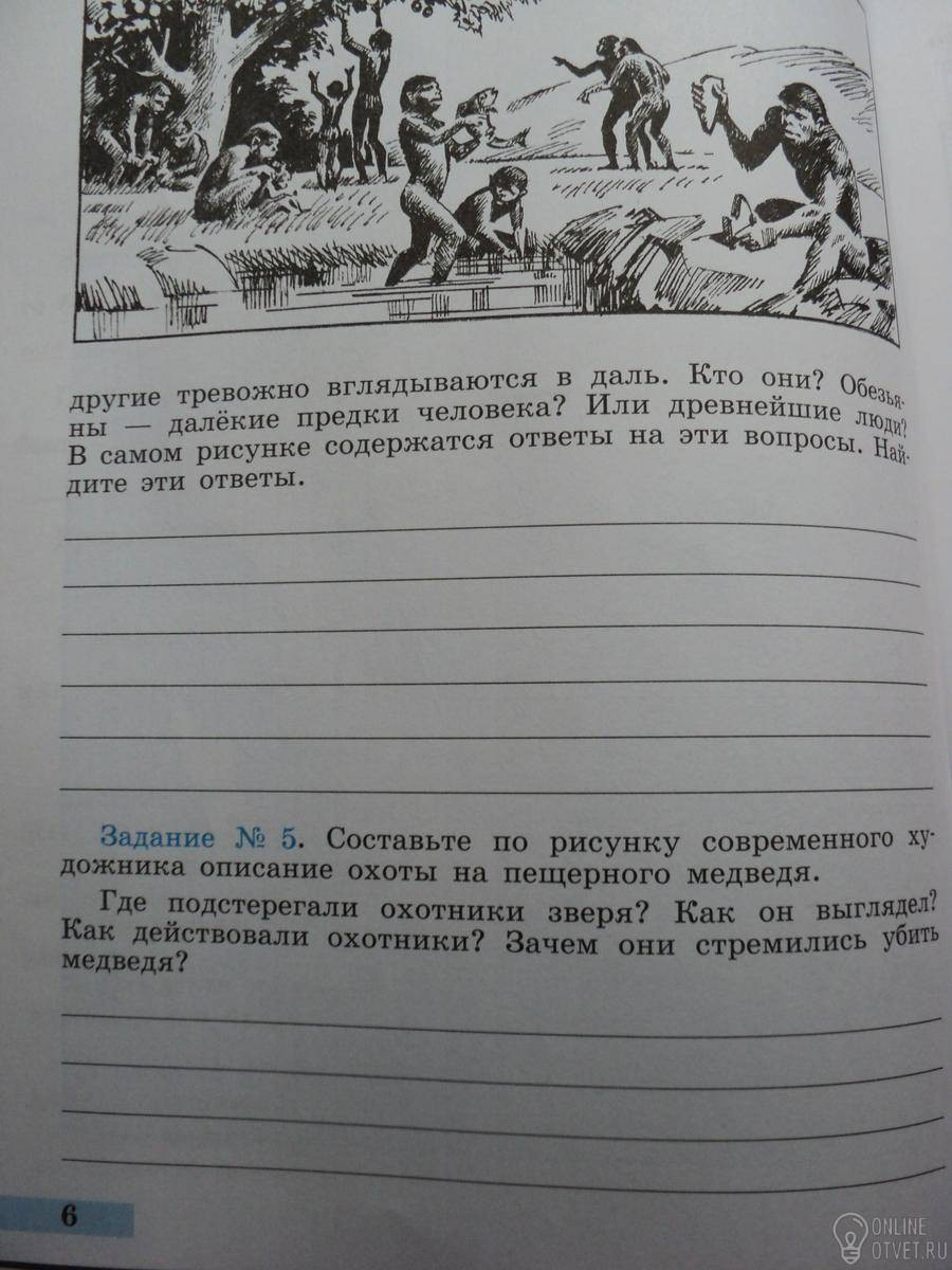 На рисунке изображены древнейшие люди. Если бы они были обезьянами, то не смогли бы сделать орудия труда. На картинке видно что человек что то делает из камня. Наверняка это и есть орудие труда. Рядом мальчики ловят рыбу, а позади женщина рвёт яблоки. Это и есть объяснение тому, что на картинке --- древнейшие люди... 5). Охотники подстерегали зверя на скале, над пещерой. Медведь был в ярости , с большими зубами и когтями. Несколько охотников кидали в него камни, а остальные стояли с копьями и уже были готовы убить его. Они стремились убить медведя из-за его шкуры (одежда), и мяса (пища, еда). Ну вот и всё.... :-)