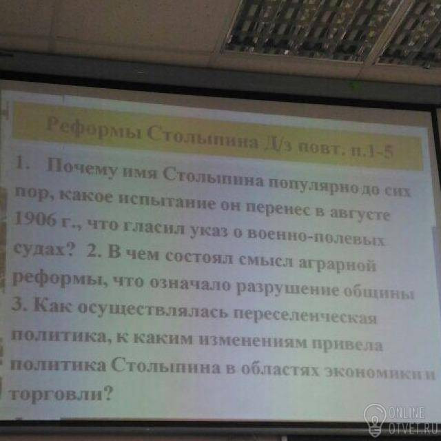 1.В 1906 Николай 2 предложил Столыпину пост миьнистра внутренних дел России. Вскоре после этого правительство было распущено вместе с Государственной думой I созыва, а Столыпин был назначен новым премьер-министром.Принятый правительством закон о военно-полевых судах ужесточал наказание за совершение тяжких преступлений. Впоследствии Столыпина резко критиковали за жёсткость проводимых мер.2.В аграрной реформе говорится о введение частной крестьянской земельной собственности. 3 не знаю