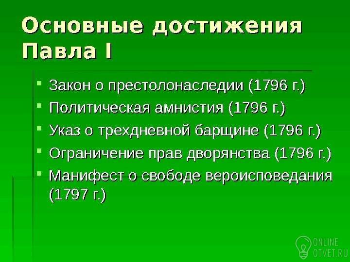Выберете неверные утверждения. а) Павел 1 вступил на престо в начале 1796 года, а уже в апреле им был издан Указ "О престолонаследие", который положил конец свободному назначению государем своего наследника б) в 1797 году Павлом 1 был издан указ, запрещавший заставлять крестьян отбывать барщину свыше двух дней в неделю в) после вступления на престол Павла 1 стало. запрещено носить круглые шляпы, сапоги с отворотами и длинные панталоны г) при Павле 1 была введена строжайшая цензура, закрыты частные типографии, запрещен ввоз иностранных книг и ог.