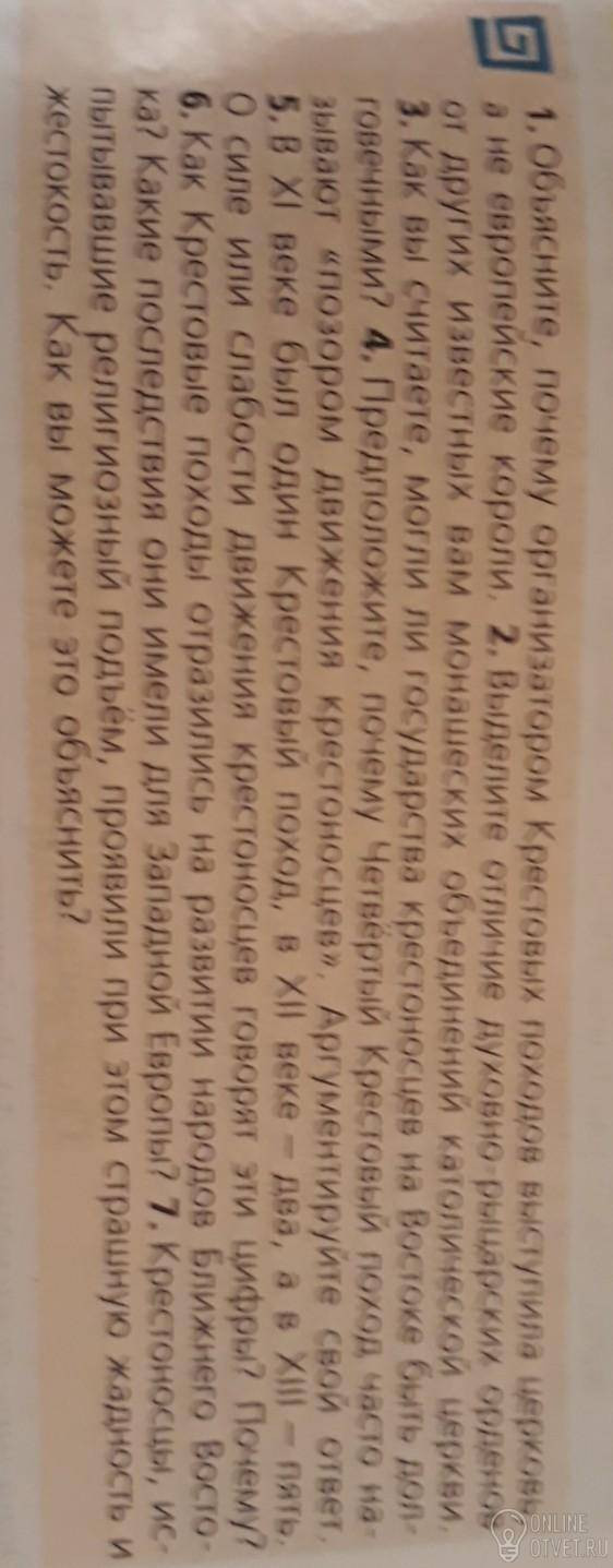 1. Церковь хотела ещё больше земли.2. Они воевали.3. Нет, так как могло бы произойти восстание коренных народов и крестоносцы бы отступили назад и потеряли много земель.4. Они пошли на слабую страну это ниже их чести.5. О слабости, так как из-за жадности и обмана они с помощью слабых и почти безоружных крестьян и хорошо подготовленных феодалов, захватывали всё больше и больше земель для богатой церкви.6. Приостановилось развитие так как крестоносцы захватывали народы и некому было возрождать их культуру. Только прибыль.7. В пути за славой и деньгами они забыли про милосердие и человечность.