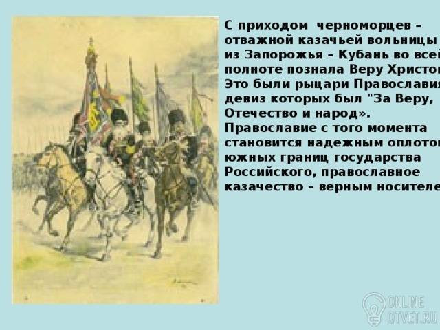 Христианская вера была основой жизненного уклада и традиций казачьей общины, где суть всего бытия понималась как служба Богу, Царю и Отечеству. На протяжении столетий глубокая вера определяла и мировозрение казачества. В отписке от 3 декабря 1637 года о взятии Азова, среди главных причин своих действий казаки называли глумление турок над Православной верой и разорение церквей. Во вссе времена наши недруги искали ключ к "великой тайне" непобедимости русского духа. Одна из главных составляющих этого духа и есть Православие. Казак с молоком матери впитывал, что "положить живот за други своя" и "за Престол Пресвятой Богородицы" богоугодное дело и всю свою сознательную жизнь готовился к этому, ибо "зачем иметь меч, если им не сечь то, для чего он выкован". То есть - зачем именовать себя казаком если не служить Вере. Царю и Отечеству".