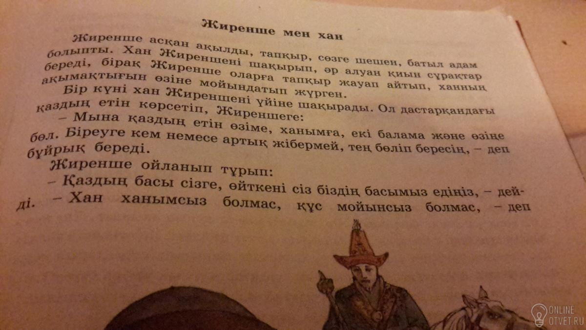 в один день хан позвал жиренше домой. он показал на лежащего на столе гуся и сказал жиренше : раздели этого гуся мне, ханым, моим двум сыновьям и себе. но чтобы ни меньше не больше а у всех по ровну было. жиренше по думав говорит: голова гуся вам потому чтовы были нашей головой. не было бы хана без ханым , не было бы птицы без шеи. ТАМ ДАЛЬШЕ НЕТУ