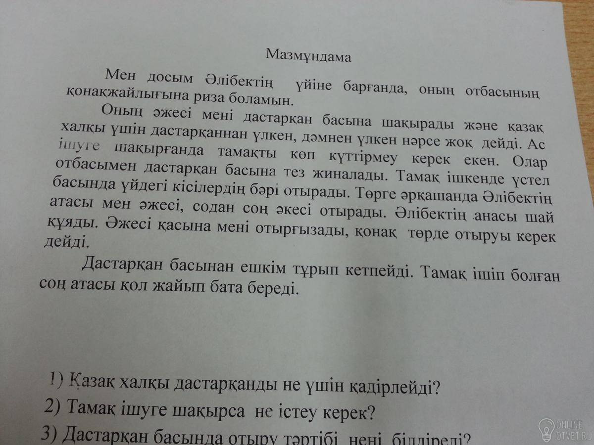 Когда я хожу домой к Алибеку, всегда остаюсь довольным их гостеприимству. Его бабушка сразу зовет к столу, объясняя тем, что нет (выше) важнее ничего дастархана и еды на нем. Оказывается, когда зовут к столу, то нельзя заставлять долго ждать себя. Они всей семьей быстро собираются за обеденным столом. К столу приглашают и гостей дома. Почетное место за обеденным столом занимают дедушка и бабушка Алибека, затем садится его папа. Мама же разливает всем чай. Бабушка Алибека всегда сажает меня рядом с собой, приговаривая, что гость всегда должен сидеть на почетном месте. Никто не покидает обеденный стол . После обеда его дедушка, разложив руки, дает свое благословение.