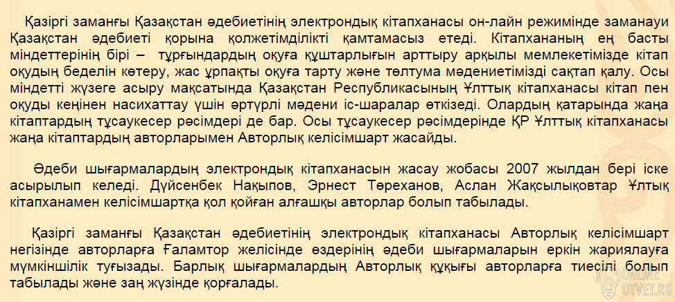 Пожалуйста, составьте небольшое сообщение на тему: "Электронная библиотека" на казахском языке!(маленький рассказ) Срочнооооооооооо