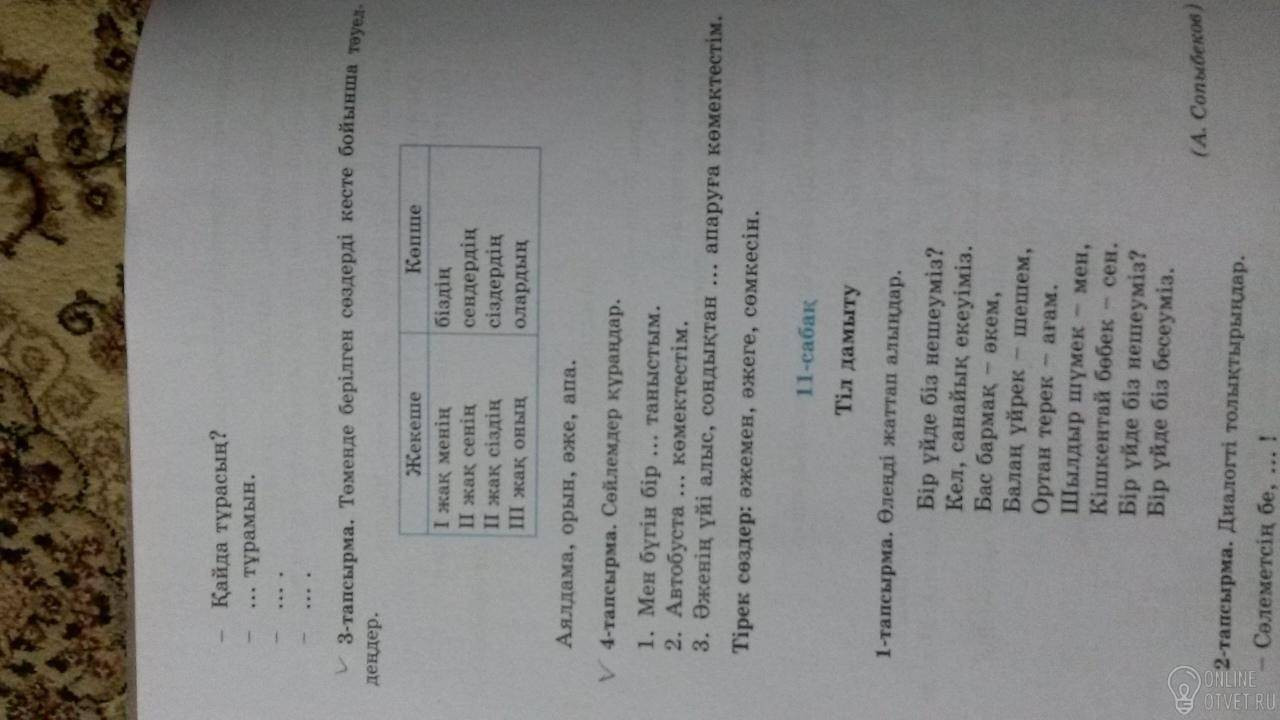 3. менің аялдамам,орыным,әжем,апам Сенің аялдамаң,орының,әжең,апаң Сіздің аялдамаңыз,орыныңыз,әжеңіз,апаңыз Оның аялдамасы,орыны,әжесі,апасы Көпше түрі: Біздің аялдамамыз,орынымыз,әжеміз,апамыз Сендердің аялдамаларың,орындарың,әжелерің,апаларың Сіздердің аялдамаларыңыз,орындарыңыз,әжелеріңіз,апаларыңыз. Олардың аялдамалары,орындары,әжелері,апалары. 4.Тапсырма 1.Әжемен 2.Әжеге 3.Сөмкесін