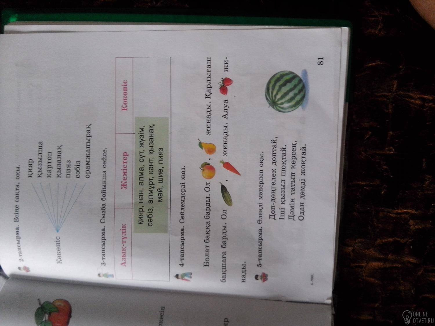 Болат баққа барды. Ол алма, алмұрт жинады. Қарлығаш бақшаға барды. Ол қияр, сәбіз жинады. Алуа құлпынай жинады.