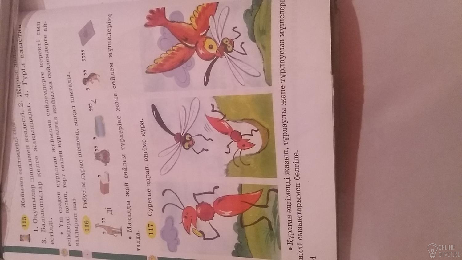 Бир куни бир кумырыска келе жаткан . Содан сон бир инелик келелди де кумырысканы терен апанга итерип жибереди .Кумырыска комек шакырады . Бир кус келип кумырыскага комектеседи . Солай кумырыска апаннан шыгады .
