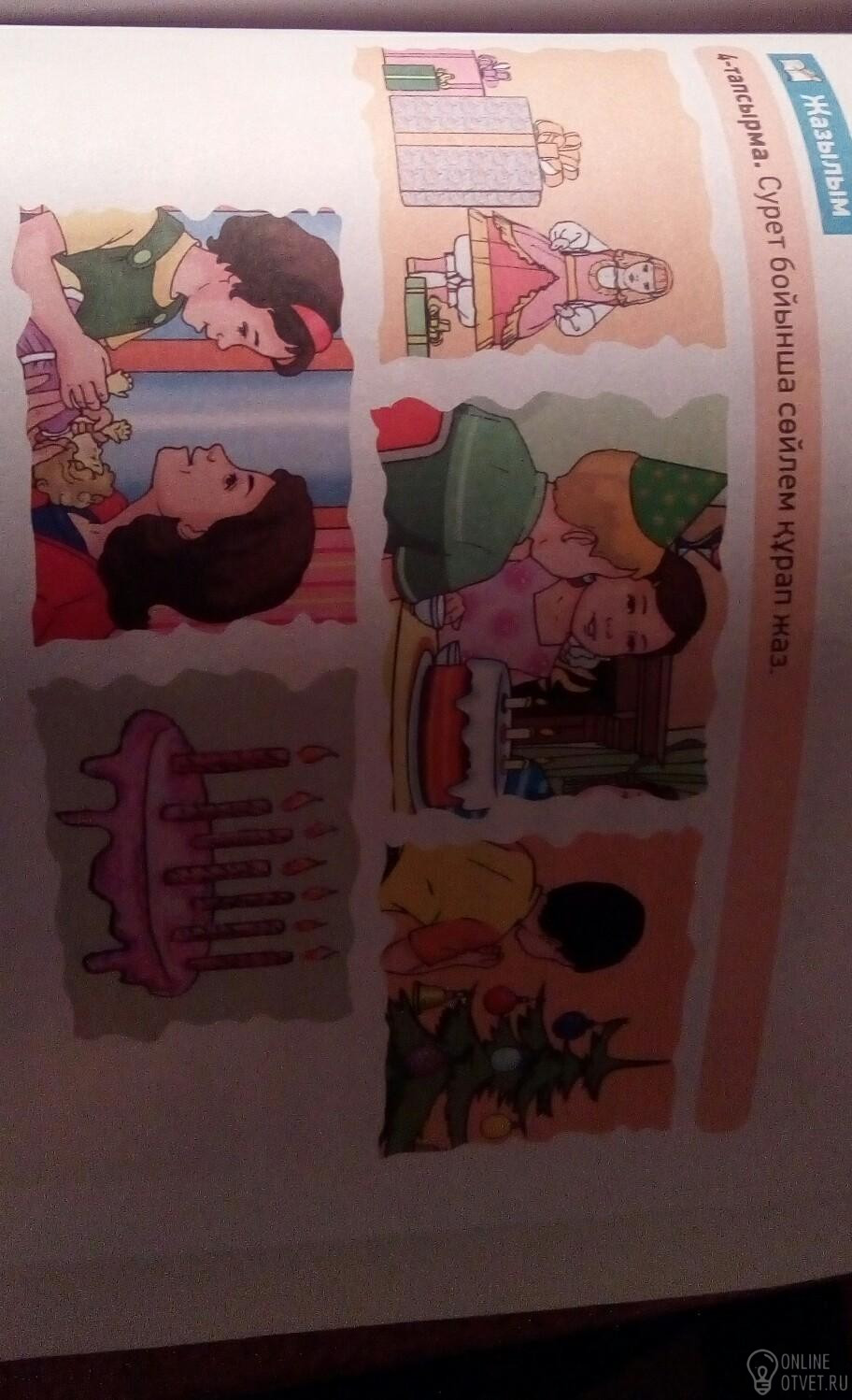 Қыз сыйлықтар алды.Бүгін ұлдан туған күні.Бала шыршысын киюге жатыр.Қыз анамен сөйлеп жатыр.Торта жеті шамдар тұр.