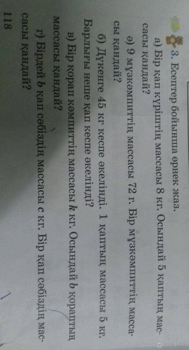 б)Дүкенге 45 кг кеспе əкелінді .1 қаптың массасы 5 кг. барлығы неше қап кеспе əкелінді.