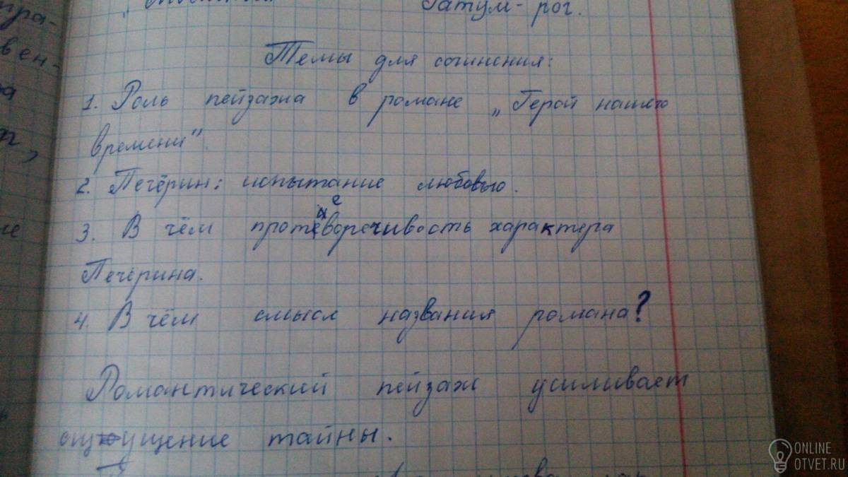 Пейзаж в романе нигде не даётся как самостоятельная картина, не связанная с действием. Он выполняет различную роль. То описывается место действия, то пейзаж привлечён для лирической передачи той или иной оценки жизненных явлений, то это средство характеристики героев, их душевных настроений. Когда Печорин едет на место дуэли, его охватывает перед лицом грозящей опасности жажда жизни, любовь к природе. Он не может вдоволь насладиться красотой природы в час восхода солнца. Но вот он едет обратно. «У меня,— пишет он,— на сердце был камень. Солнце казалось мне тусклым, лучи его меня не грели». Такой представляется природа Печорину в его тяжёлом душевном состоянии.