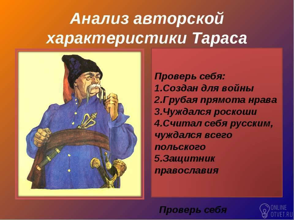 Он сильный, смелый, решительный воин и отец. Честно выполняя свой долг, Тарас Бульба громит польских захватчиков. Но ему выпадает на долю великое испытание. Его младший сын Андрий -- предатель. И Тарас находит в себе силы казнить изменника. Видят его старые глаза и гибель сына-героя Остапа. Что остается ему -- умереть за родину, это и делает полковник. Он не просто гибнет, а спасает своих товарищей. Не думая о себе, о том, что огонь уже лижет его ноги, Тарас кричит, помагая саратникам уйти от преследователей. Да, он погиб мученической смертью, но не сгинул его отряд, который будет бить врагов до победы.