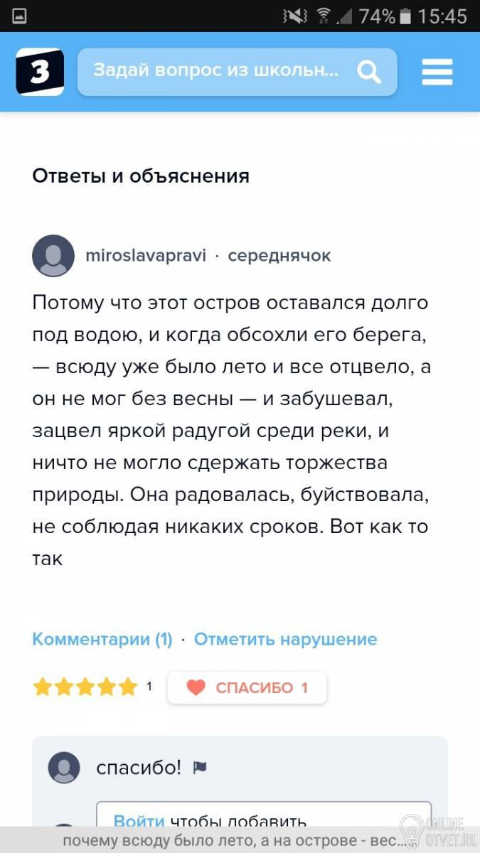 Почему всюду было лето, а на острове-весна? Виктор Астафьев "Весенний остров" Скажите ответ пожалуйста.пароход миновал порог и сразу Енисей Енисей сделать все серии раздольный а высота берегов пошла на убыль чем шире становился Енисей тем положе делались берега Тихого течения река усмирялась катила воды без шума и суеты. И т.д