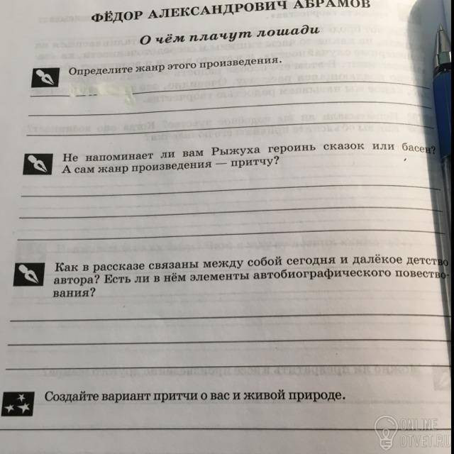 1.В рассказе «О чем плачут лошади» автор необыкновенно реалистично изображает русскую природу. Читатель просто физически ощущает запах разнотравья, видит порхание бабочек и стрекоз, ощущает прикосновение лошадиных губ — мягких и теплых.