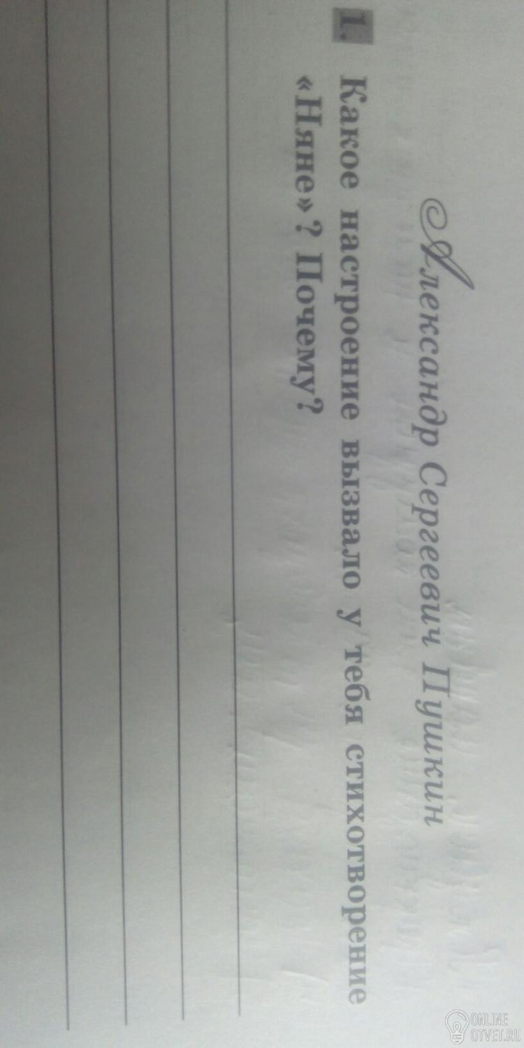Стихотворение "няня" вызывает у меня какую-то грусть. Кто не согласится с этим? Няне"Подруга дней моих суровых,Голубка дряхлая моя!Одна в глуши лесов сосновыхДавно, давно ты ждешь меня. " Эти строки нагоняют на меня грусть. Мне сразу представляется пожилая женщина, которая смотрит в окно, и думает о ком-то. Мне представляется пасмурная погода. В общем, мне становится грустно, когда я читаю этот стих.