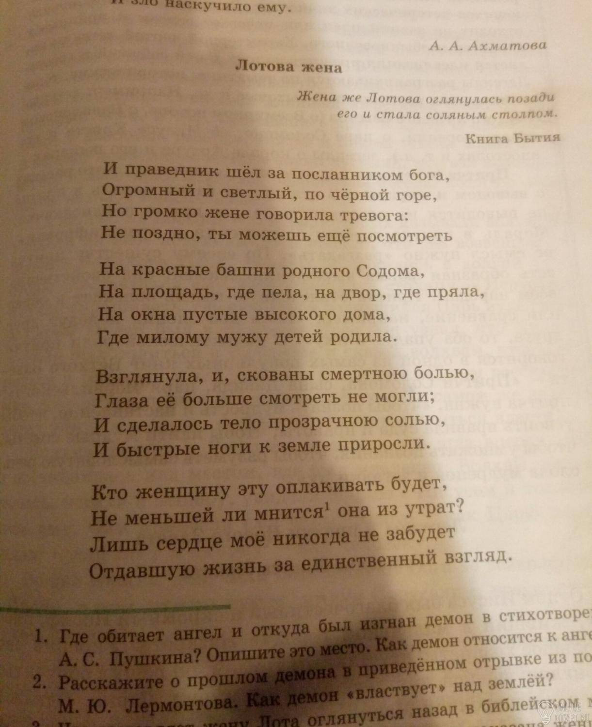 Стихотворение Анны Ахматовой «Лотова жена» – это вольный пересказ библейской притчи из Старого Завета о жене праведника Лота, семья которого была выведена ангелом из обреченного Содома. Жена Лота, несмотря на строгий наказ не оборачиваться, нарушила его и превратилась в соляной столб.