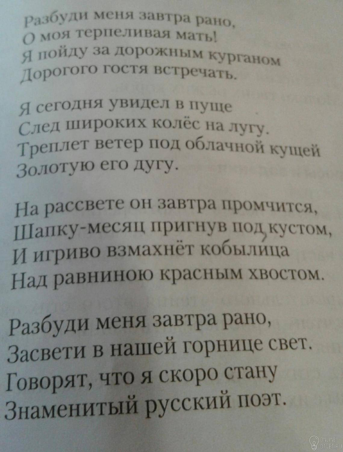 Риторическое обращение: Разбуди меня завтра рано, о моя терпеливая мать!Тема:Стихотворение явилось первым откликом на февральскую революцию. Идея:образ дорогого гостя воспринимается,как образ революции.Точного ответа каком госте пишет поэт искать бессмысленно. Переплетение образов:родной природы,дома и творчества. Композиция:На первой половине текста речь идет о "дорогом госте".В первой строфе идёт речь о доме и собственного творчества.